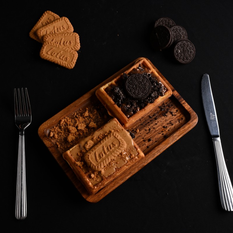 وافل سخن مقرمش من بره وطري من جوه، متزين بصوص شوكولاتة او لوتس .