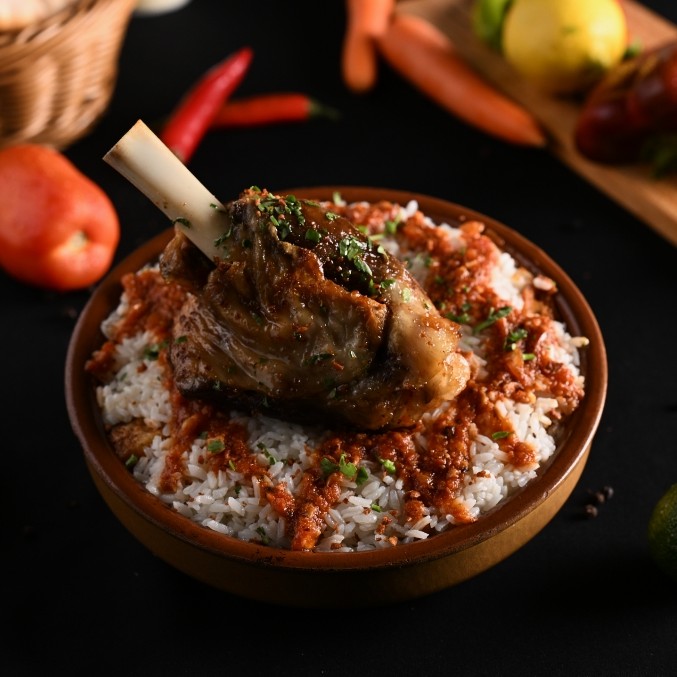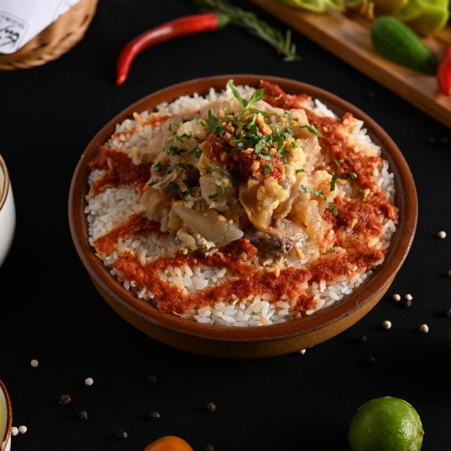 أرز بالشوربة والثوم مع لحم الموزة الطري