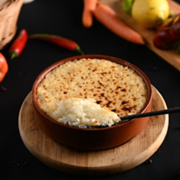 أرز مطهو باللبن والقشطة في الفرن حتى يتحمر الوجه – بدون إضافات.
