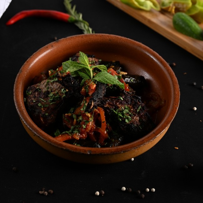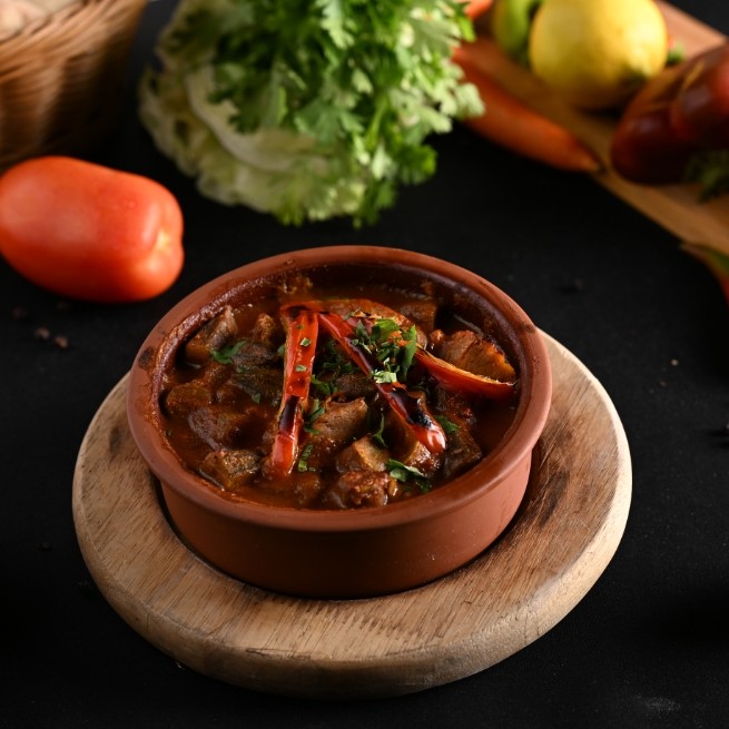 مكعبات لحم محمرة مع بصل ذهبي وصوص غني داخل الطاجن.