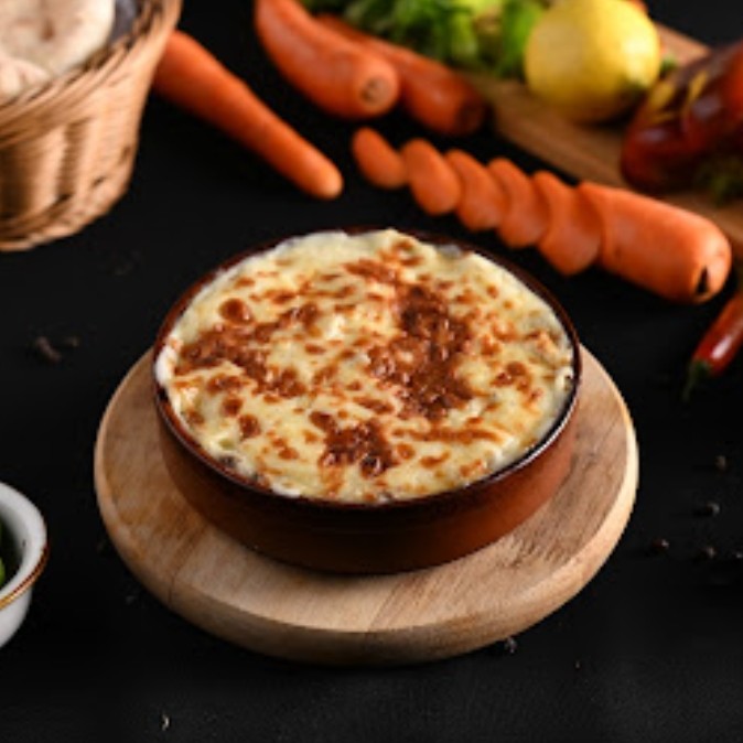 طبقات من الباذنجان والبطاطس مع اللحم المفروم بصلصة الطماطم.