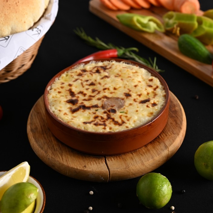 أرز معمر غني بمكعبات اللحم والعصاج، مطهو ببطء في الفرن.