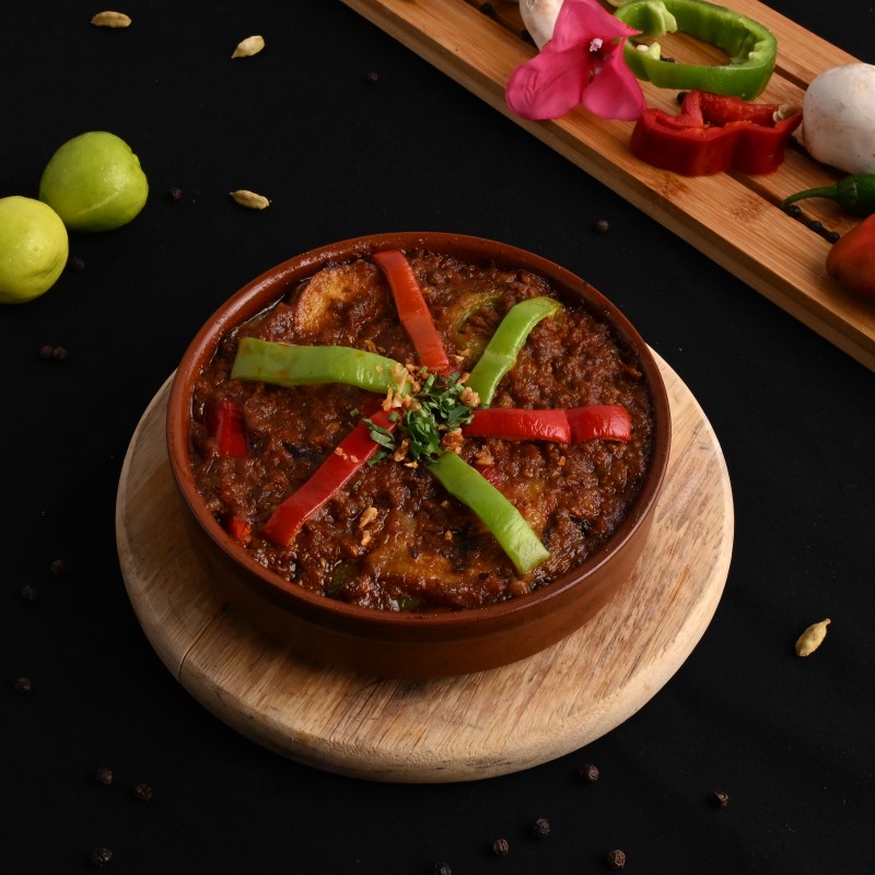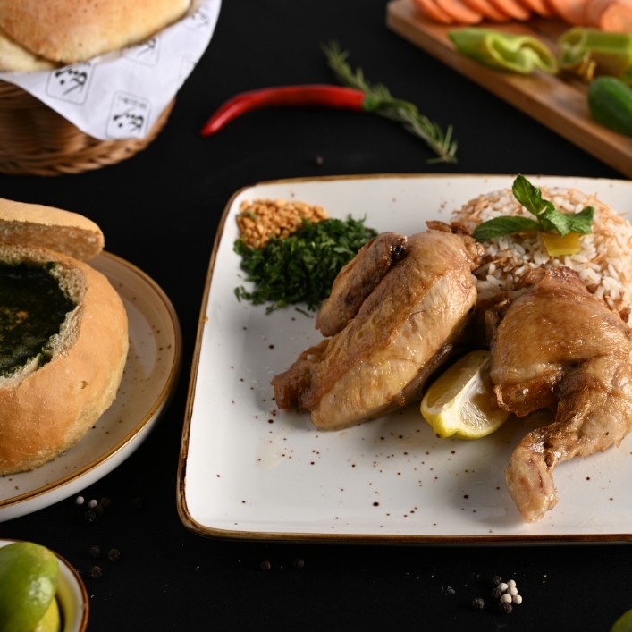 ملوخية خضراء مطهوة مع نصف دجاجة طرية، يقدم مع الأرز أو الخبز البلدي.